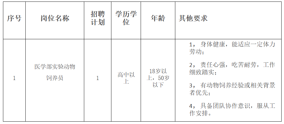采取网络报名方式,请应聘者将个人简历和本人有效身份证件和岗位要求的其他相关材料等以上材料以压缩包(其名称为“医学部实验动物饲养员+张三”发送至指定邮箱